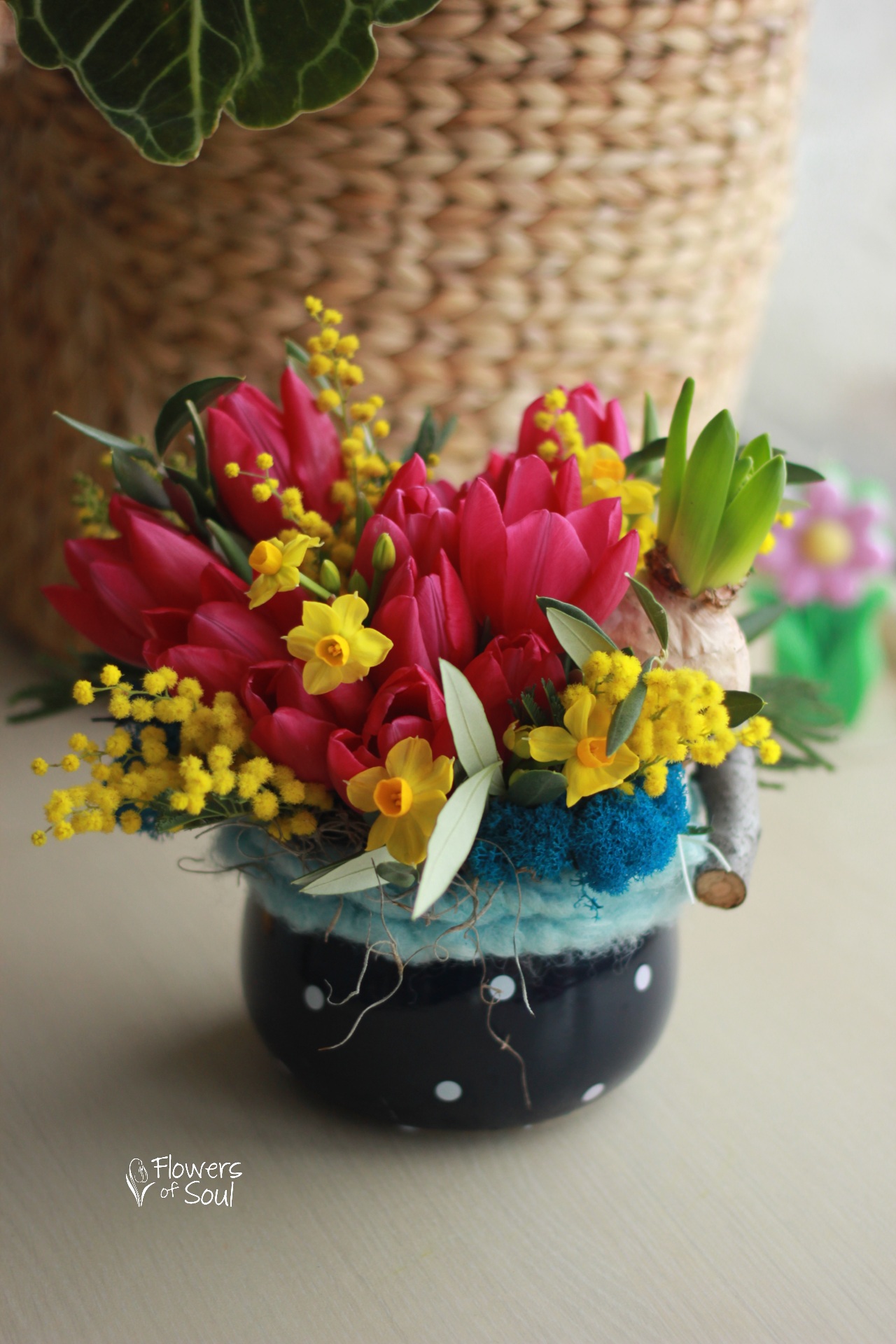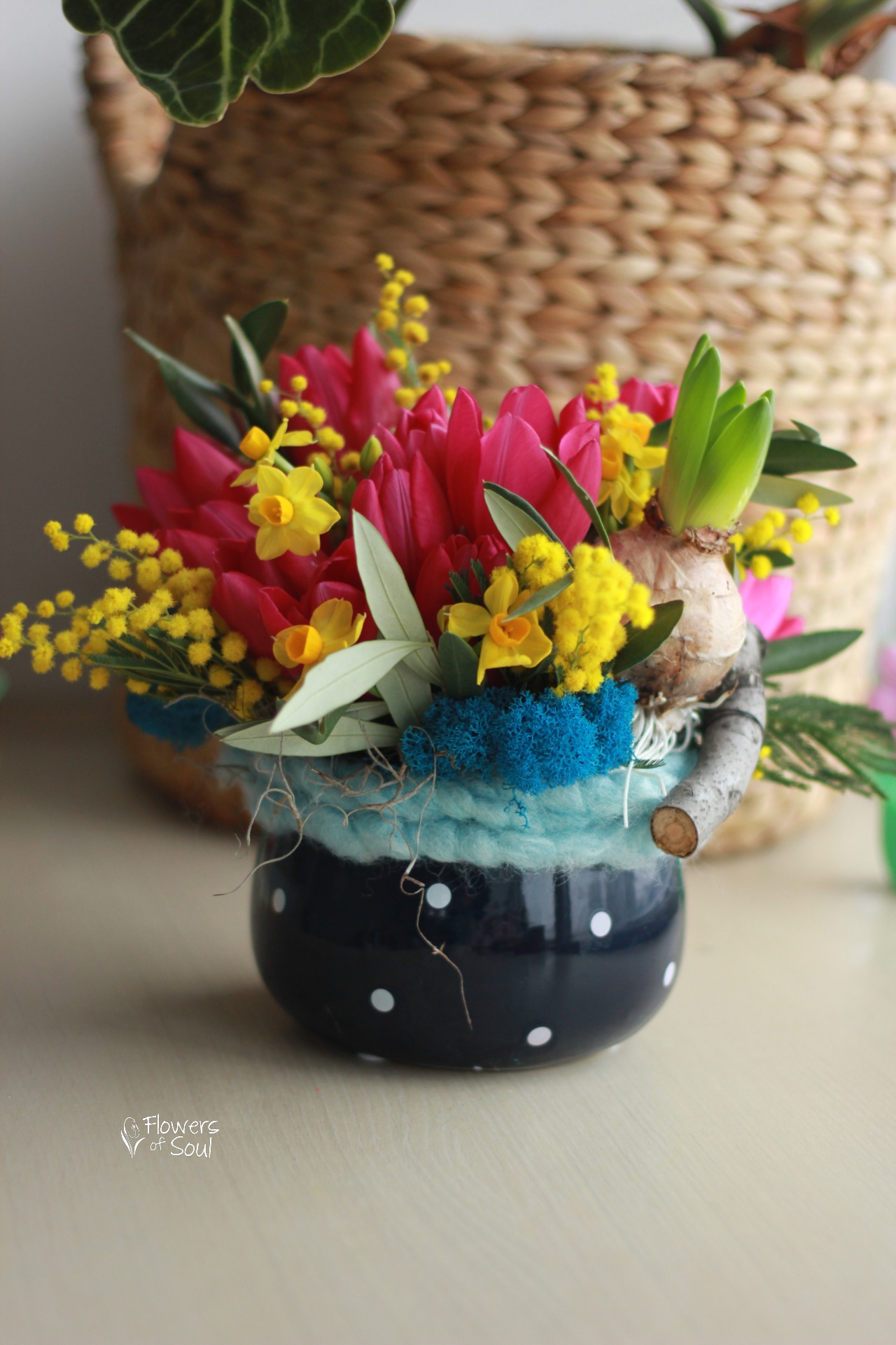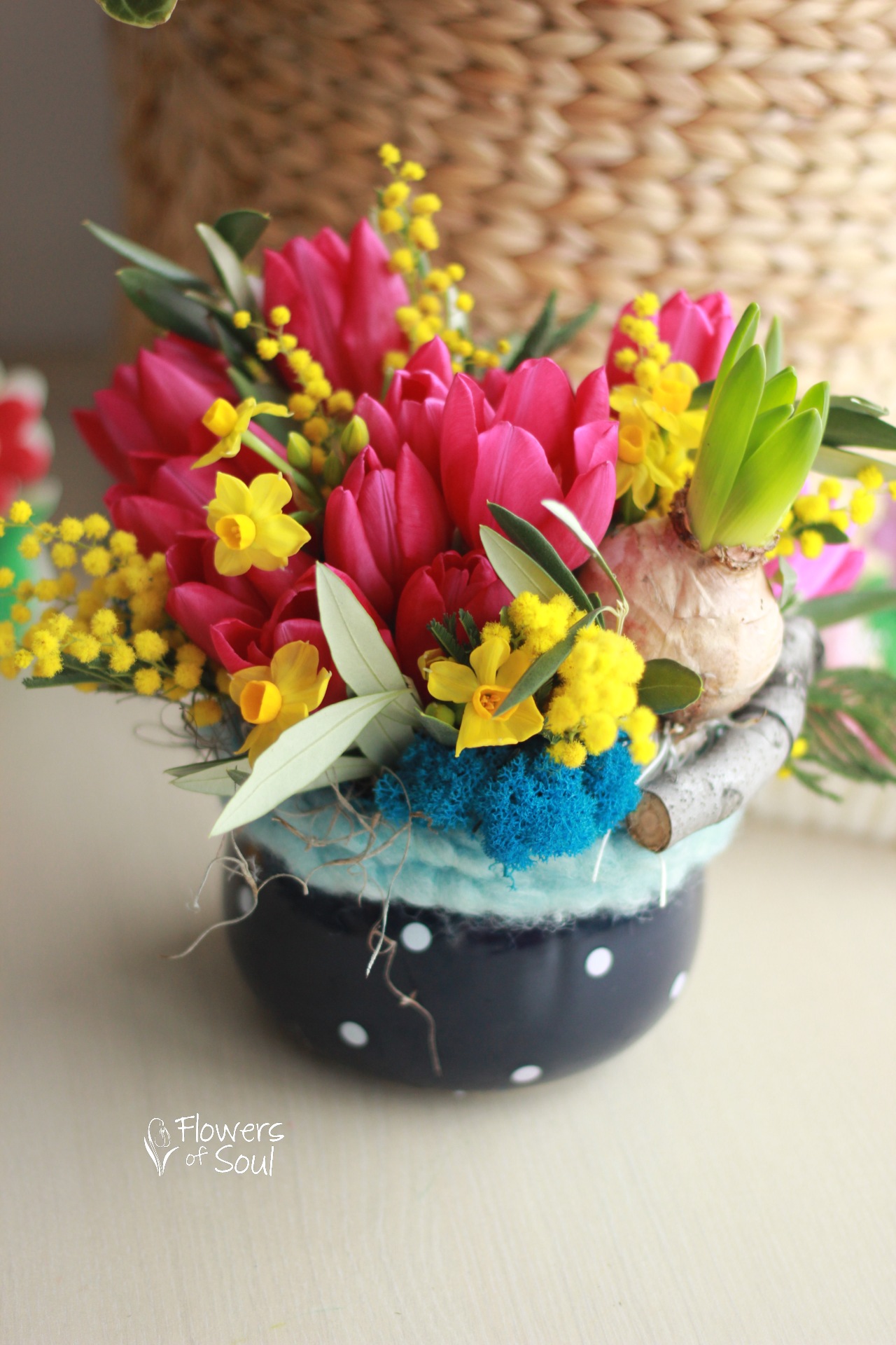 Aranjament floral realizat în vas din ceramică, alcătuit din 11 lalele, mini narcise, licheni, bulb de zambilă, mimosa, șnur din lână naturală, frunze de măslin și alte materiale pentru susținere.