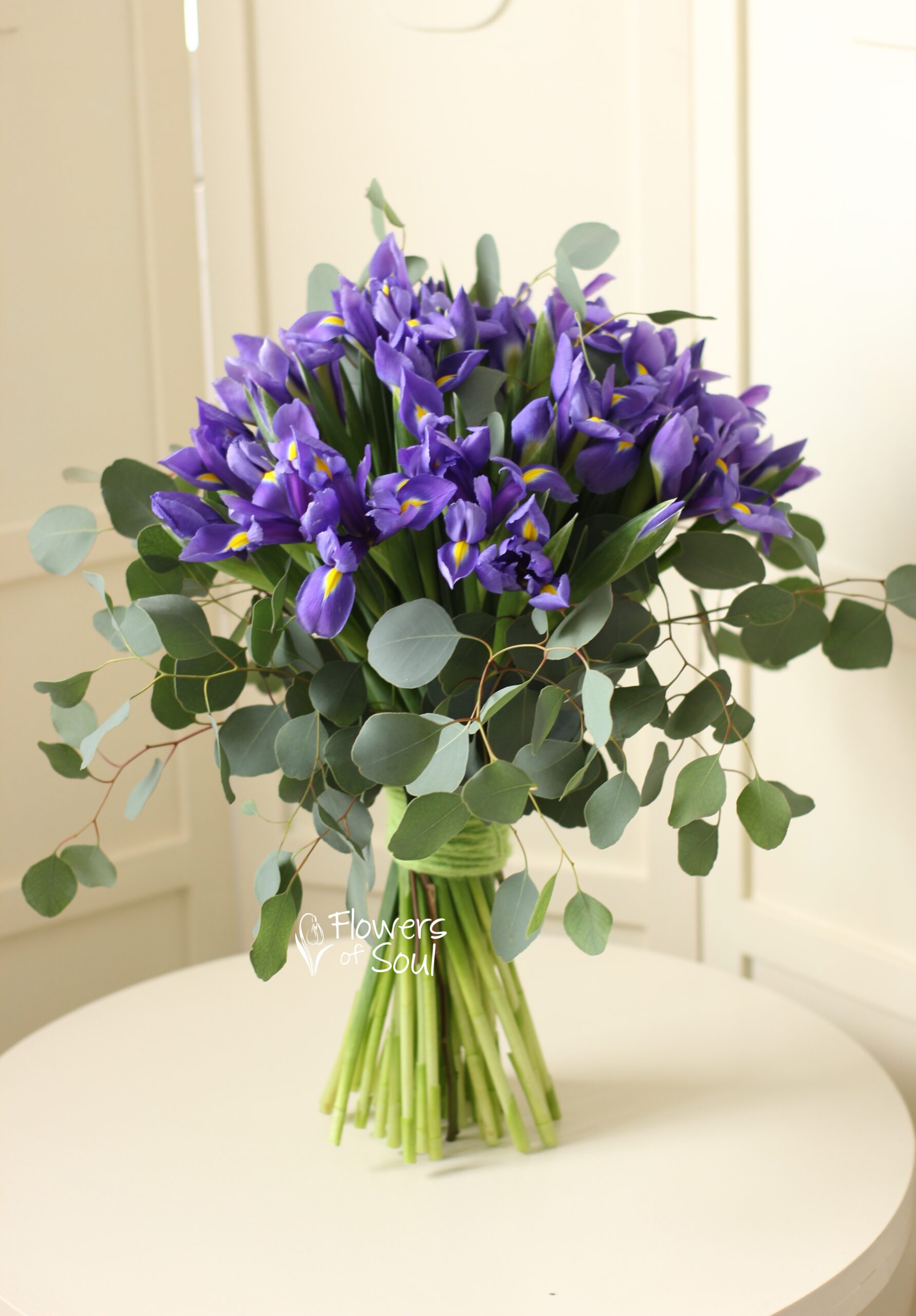 Buchet alcătuit din 47 de iriși mov și frunze de eucalipt.