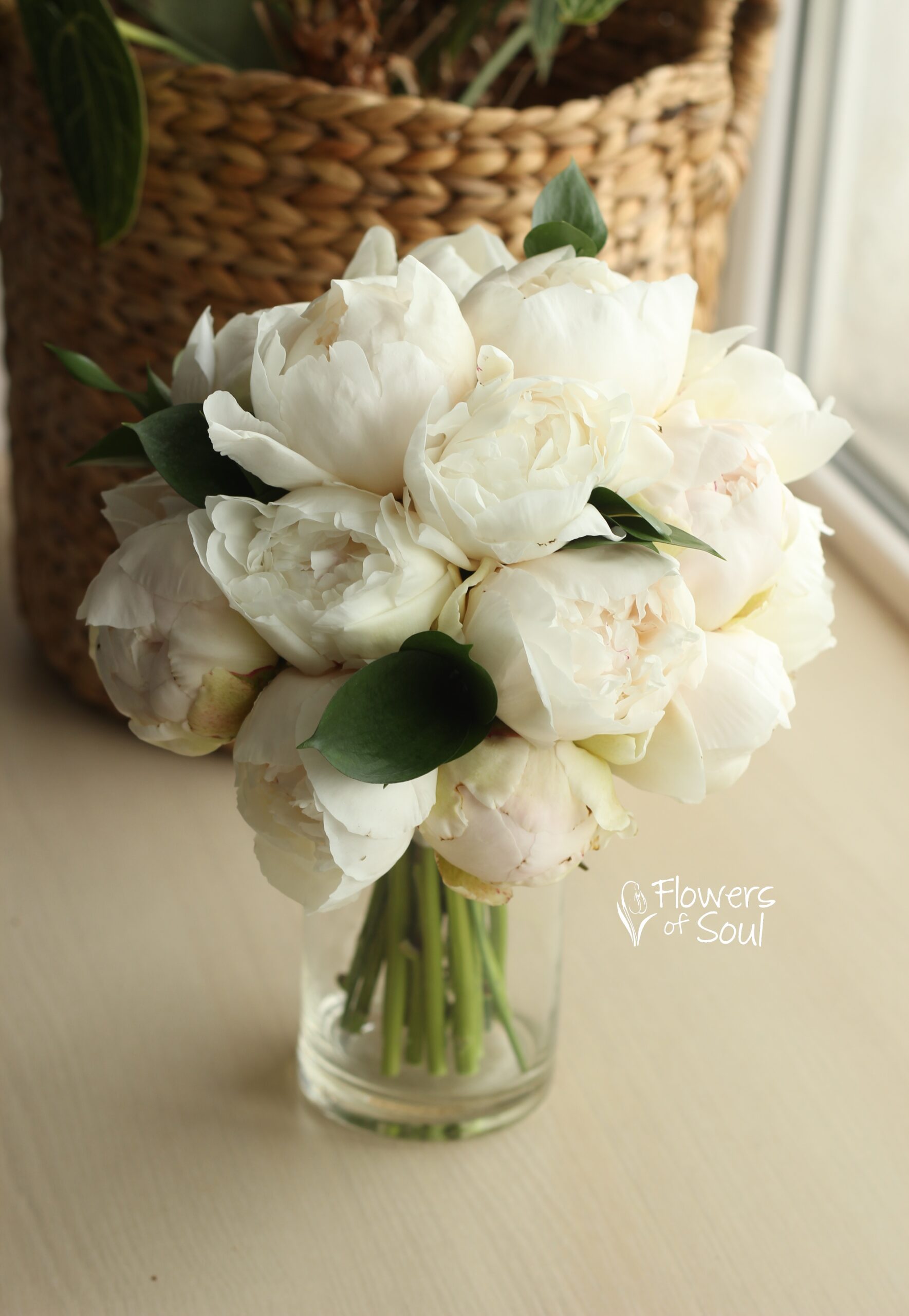 Buchet realizat din 19 bujori albi (SEZON: APRILIE-IUNIE), frunze de ruscus și materiale pentru susținere.