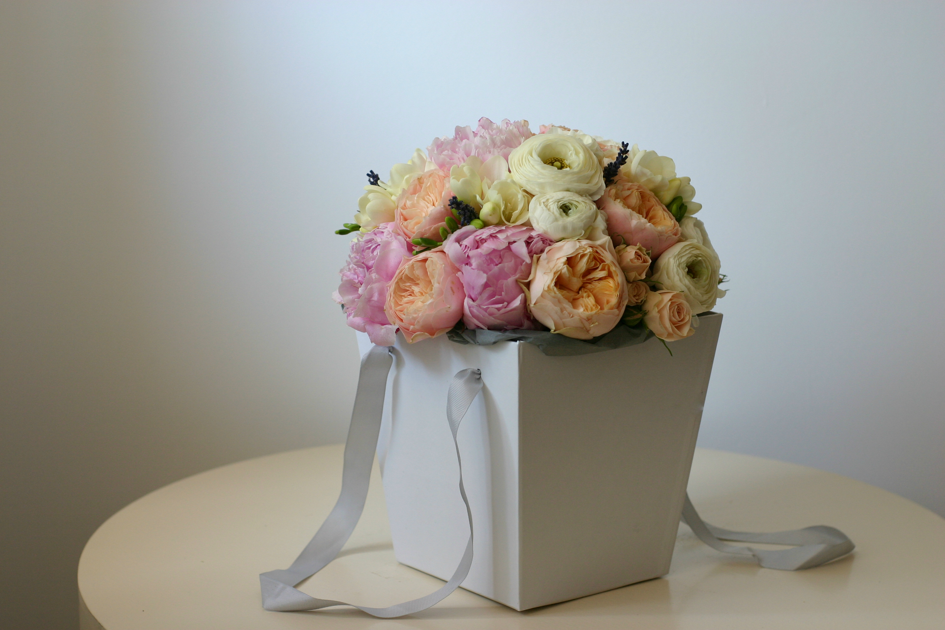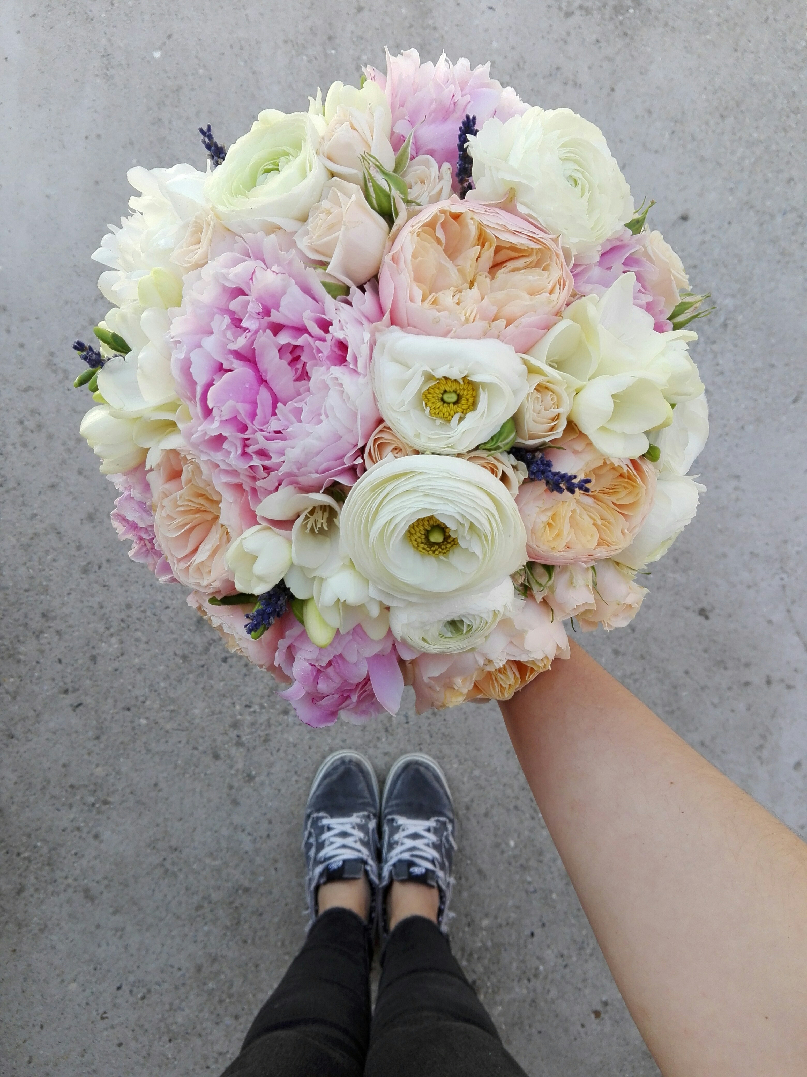 Buchet realizat cu bujori roz pal (SEZON: APRILIE-IUNIE), trandafiri vuvuzela, mini roze peach, ranunculus alb, frezii albe, flori de lavandă și materiale pentru susținere.