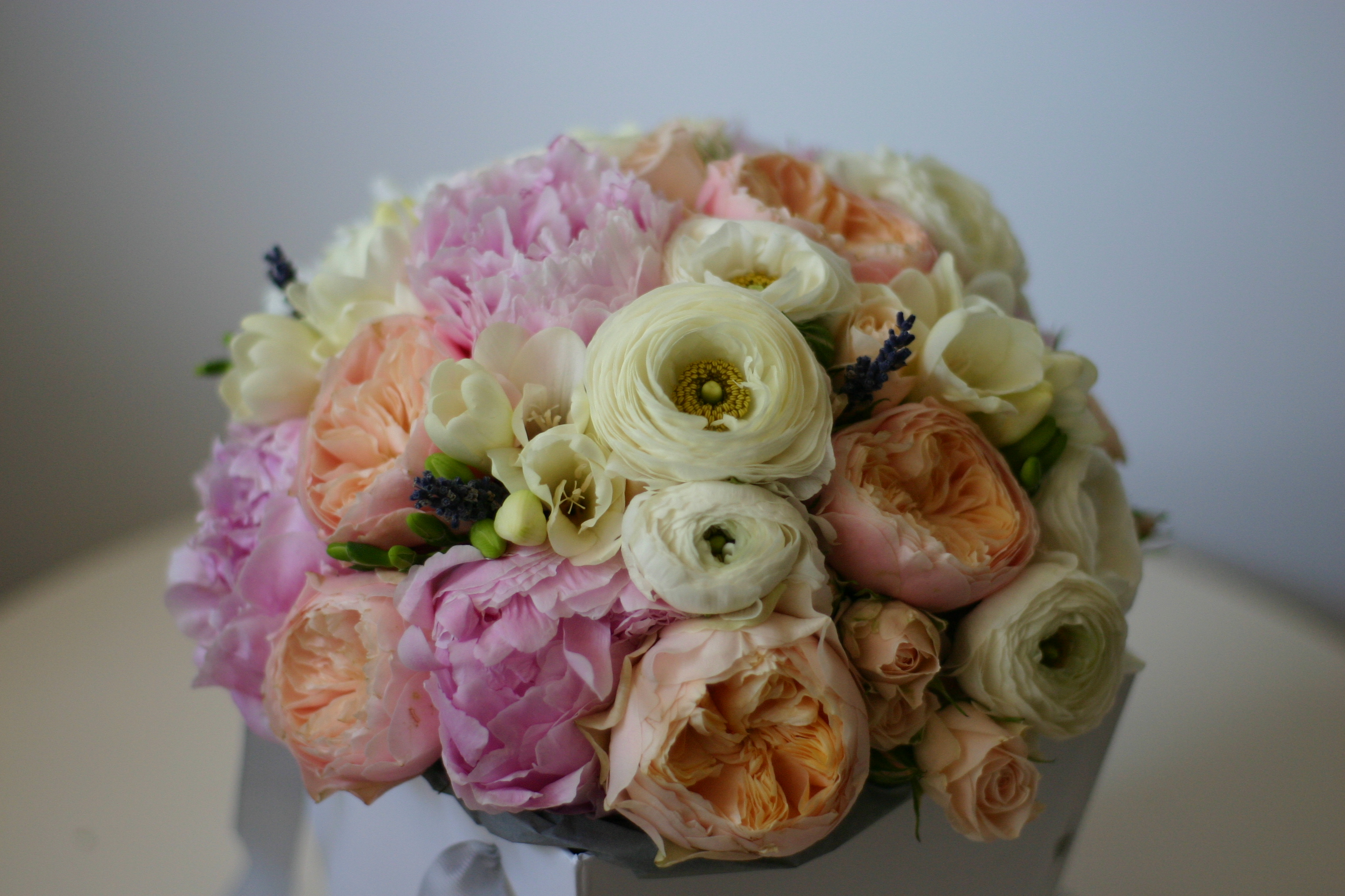 Buchet cu bujori, ranunculus, frezii, mini roze și trandafiri