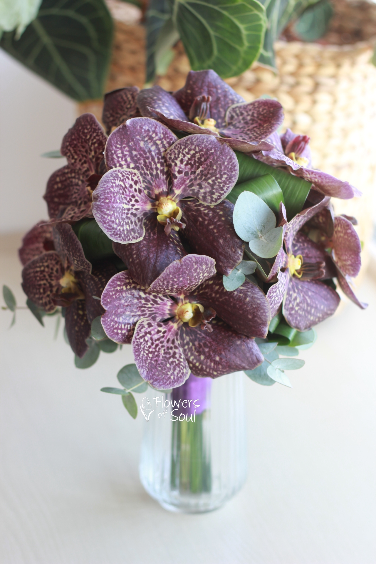 Buchet realizat din cupe de orhidee Vanda Chocolate Brown, aspidistra,eucalipt cinerea și materiale pentru susținere.