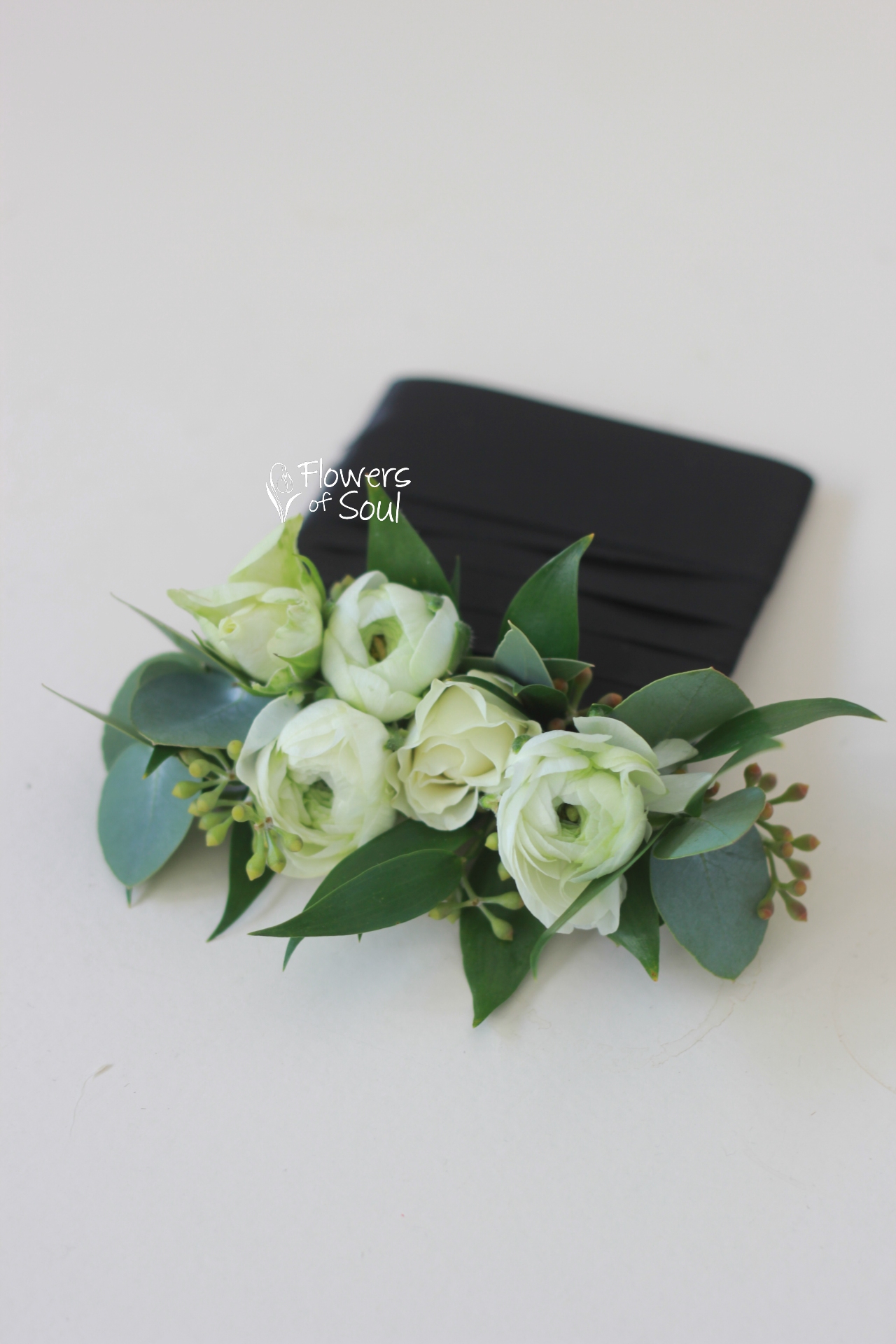 Cocardă de buzunar realizată cu mini roze, ranunculus și frunze de eucalipt.