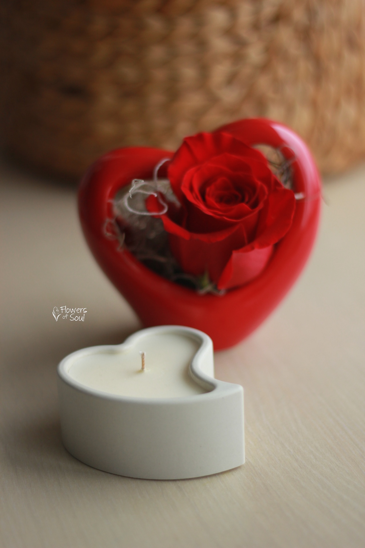 Inimă din ceramică cu trandafir roșu și lumânare din ceară de soia – Heart