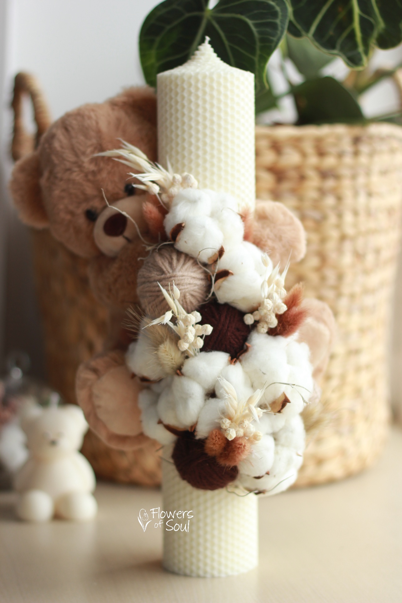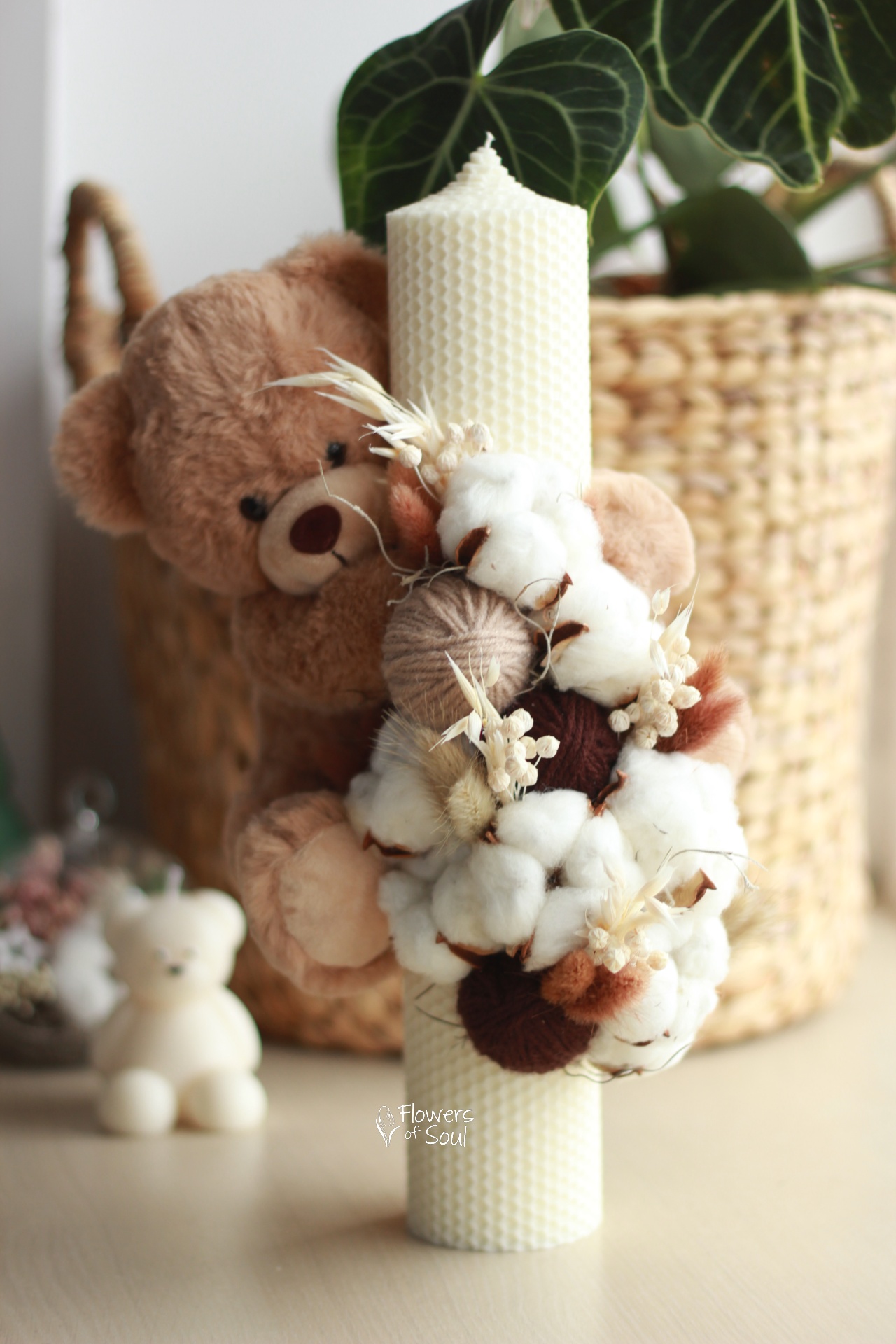 Lumânare pentru botez de 35cm înălțime x 6,5cm diametru, realizată cu flori de bumbac, lagurus, in, gheme și ursuleț de pluș.
