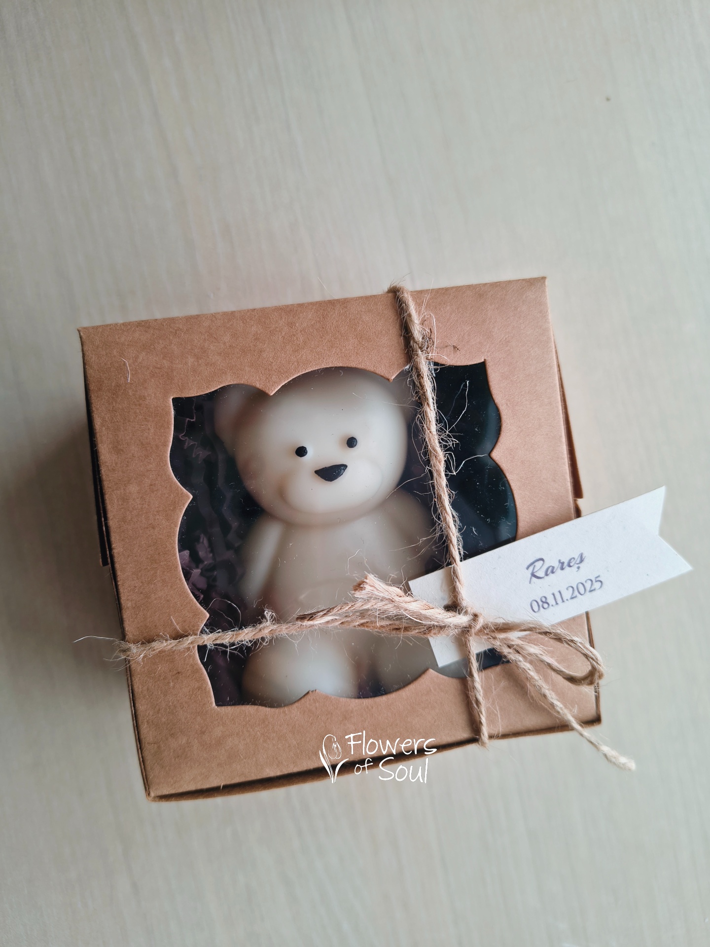 Lumânările vor fi ambalate în cutie din carton și vor avea etichetă personalizată cu nume și data evenimentului.