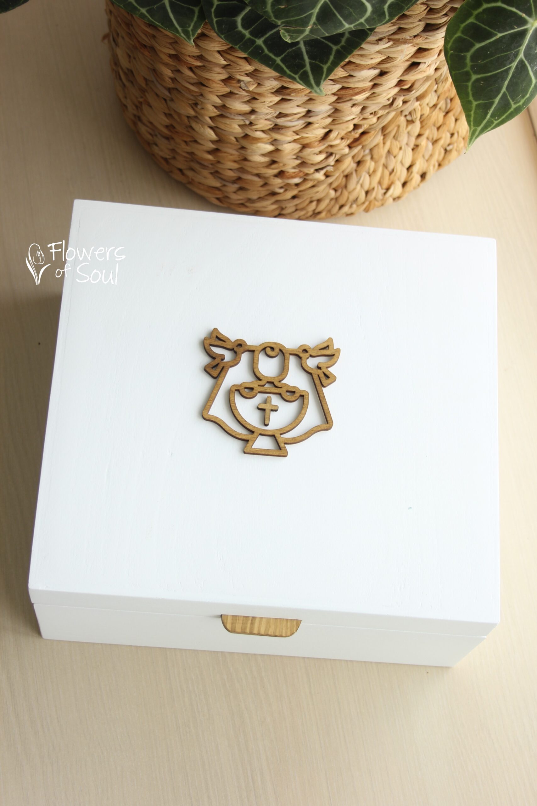 – cutie din lemn realizată manual cu multă migală și personalizată cu nume. Dimensiune: 26cm lungime x 26cm lățime.