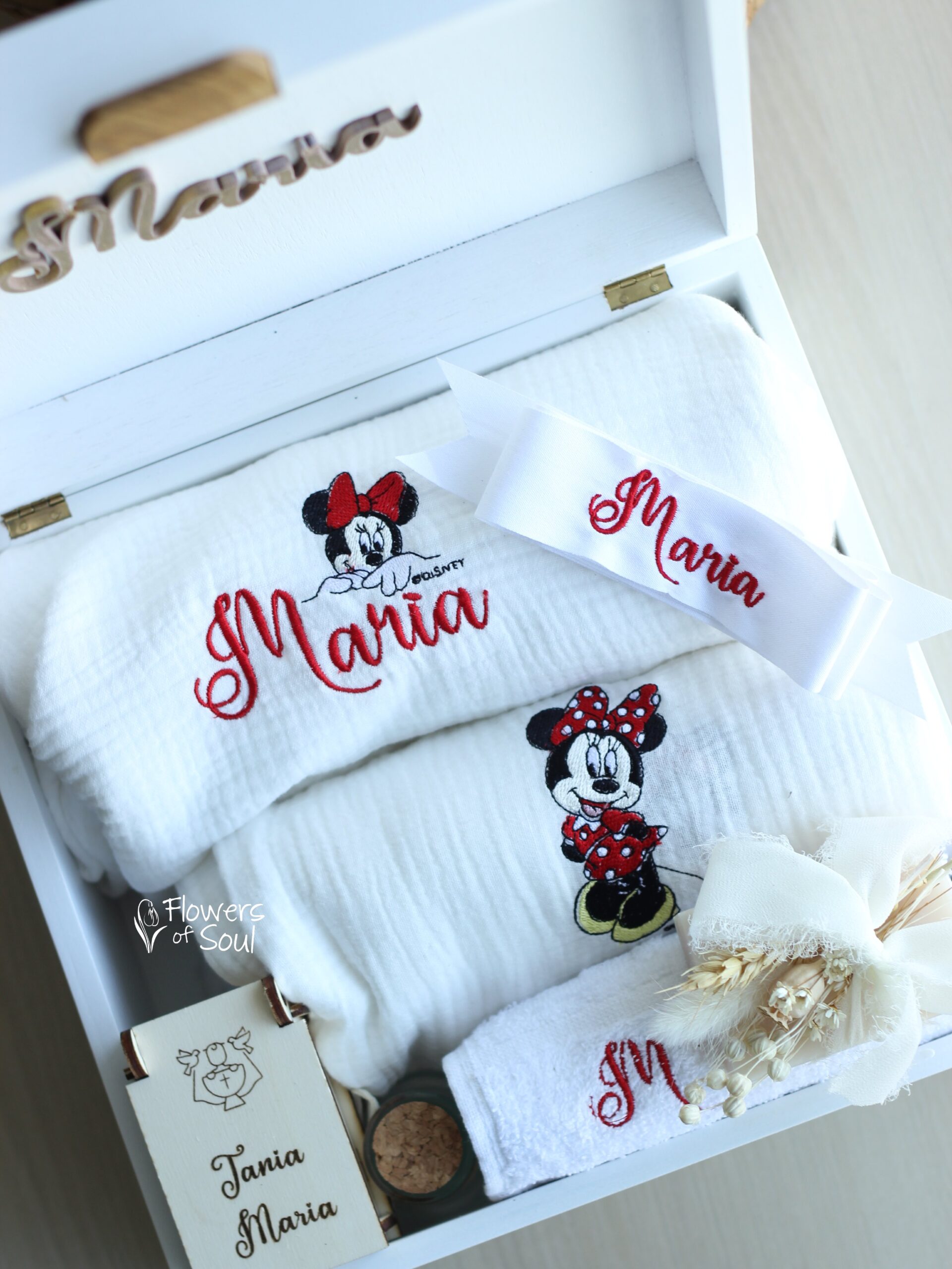 Trusou pentru botez în cutie albă din lemn – Minnie Mouse